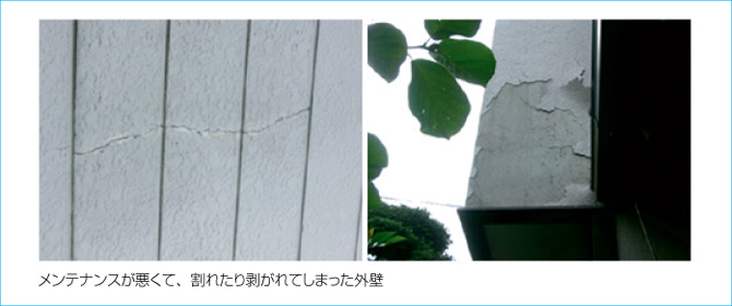塗装は年月の経過とともに必ず劣化します。塗装がはげてきたり、ひび割れがおきたり、変色したり。こういった状態を放置してしまうと、建物自体のひび割れから水がしみ込み、腐食が進み、ひいては建物がグラグラするなどの悪影響を及ぼします。