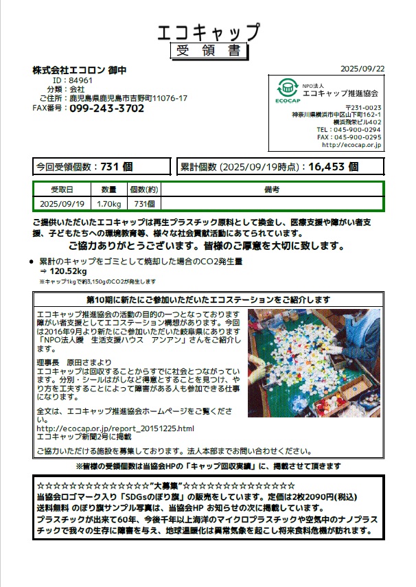 (*回収されたエコキャップは再生プラスチック原料として換金し、医療支援や障害者支援・子ども達への環境教育等、様々な社会貢献活動にあてられています。)
